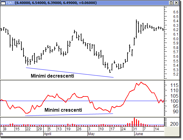 La prima anticipa un movimento al rialzo ed è caratterizzata dall’andamento ribassista dei prezzi dell’attività finanziaria che segnano minimi e massimi decrescenti mentre l’indicatore disegna minimi crescenti, come indicato nella figura che segue.