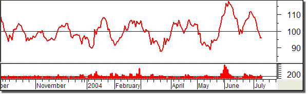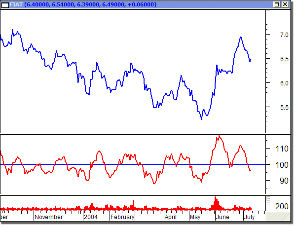 La figura che segue illustra l’andamento del momentum misurato a 10 giorni sul titolo Fiat. Ogni volta che il momentum incrocia la linea dello zero, si verifica una situazione in cui i prezzi risultano uguali a quelli di dieci giorni prima.