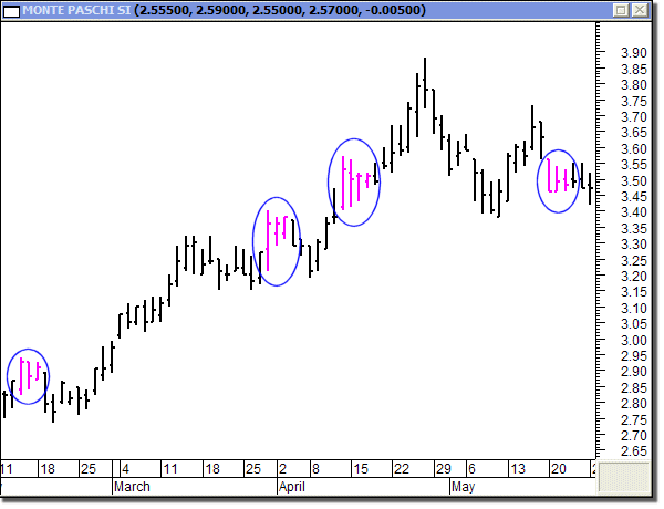 configurazioni caratterizzate da una sequenza di tre barre ciascuna delle quali ha minimo e massimo rispettivamente superiore e inferiore alla precedente. Si tratta in sostanza di una sequenza di due “inside days”, giornate in cui il minimo e il massimo si sviluppano senza superare i valori della barra precedente che indicano una progressiva compressione che potrebbe dar luogo a un’esplosione di notevole entità.