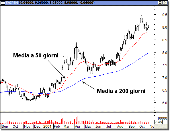 La figura seguente illustra un grafico accompagnato da due medie mobili di differente dominio temporale, rispettivamente 50 e 200 giorni. Anche a colpo d’occhio si nota che la media più breve (50 giorni) reagisce più