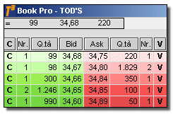 Ci sono 7 tick di spread tra il bid a l’ask. La quantità di azioni presenti è piuttosto limitata, tranne che su due livelli, il quarto in acquisto e il secondo in vendita. Per operare su un book di questo tipo è necessario conoscere a fondo quali sono le forze in gioco. Ogni titolo ha caratteristiche proprie: non è possibile intervenire su Tod’s senza conoscerle in maniera approfondita. Per prima cosa, è necessario sapere qual è lo scambio medio, ossia quante azioni passano di mano per ogni scambio.
