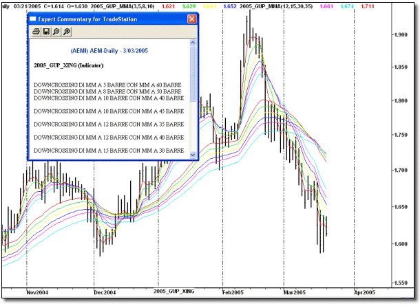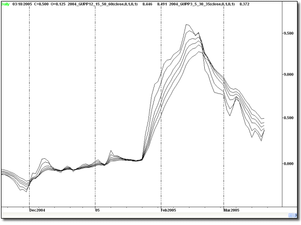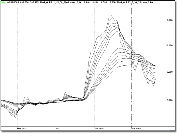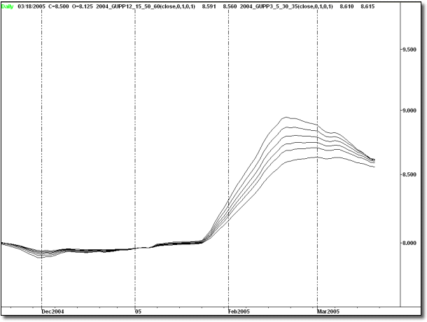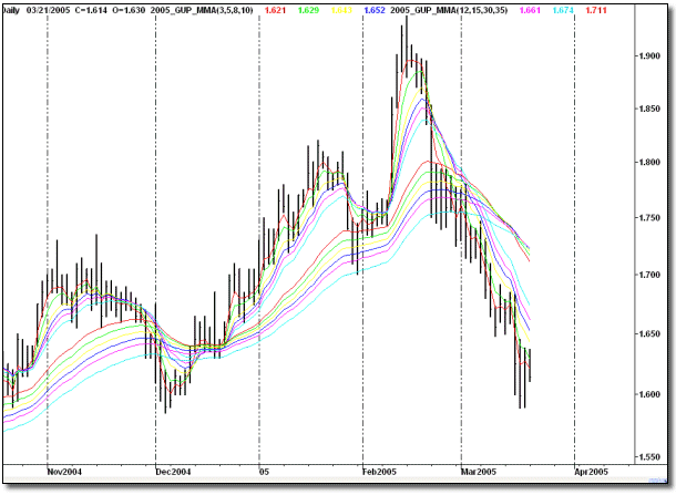 L’indicatore Multiple Moving Averages (MMA) è di costruzione molto semplice e di interpretazione molto chiara. Esso è costituito di una serie di sei medie mobili esponenziali a breve termine (con finestre di 3, 5, 8, 10, 12, 15 barre) e sei medie mobili esponenziali a lungo termine (con finestre di 30, 35, 40, 45, 50, 60 barre).