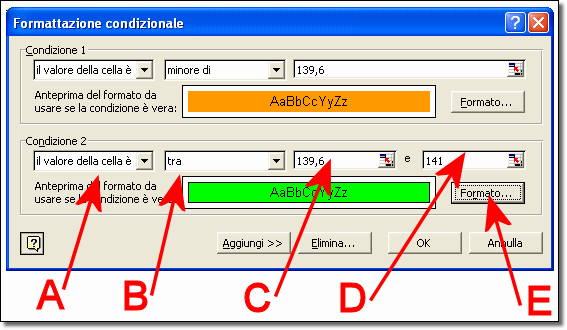 139.59999…) Excel dovrà colorarla in arancione. Per ottenere questo