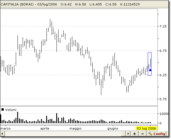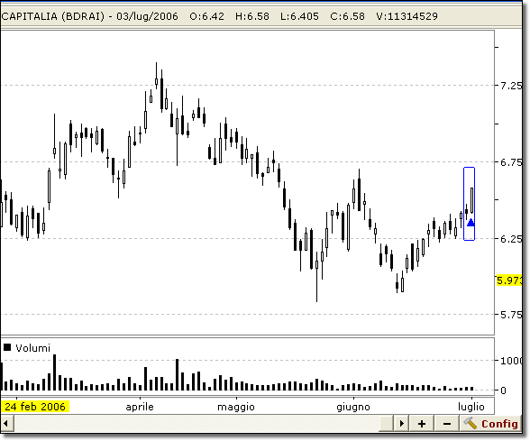 CAPITALIA, compressione temporale giornaliera, grafico candlestick. Balza
