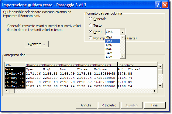 suddivisione in colonne dei vari dati. Premendo “Avanti” comparirà la terza