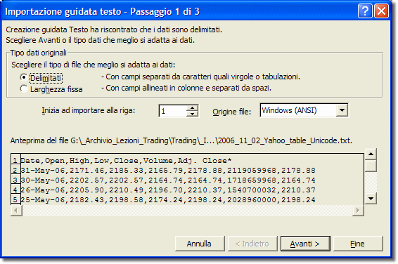 valore 1, così come “Windows ANSI” nella sezione “Origine file”. Nella