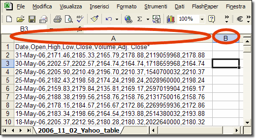 tra i vari campi (Date, Open, High…) è segnalata dal carattere