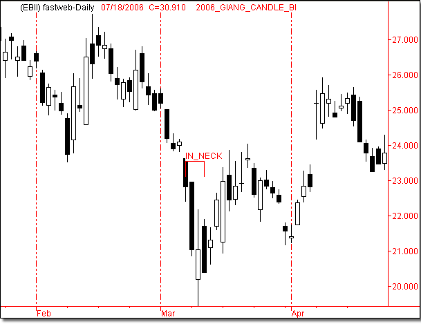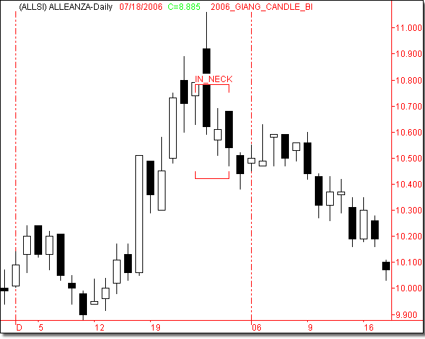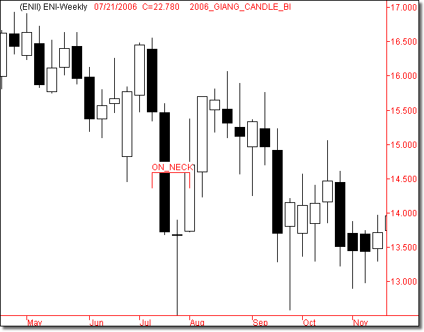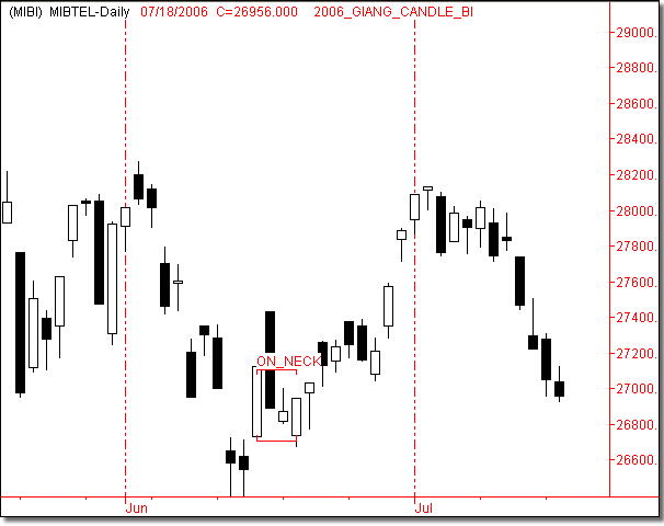 In un trend al ribasso si forma una candlestick nera lunga. La candlestick successiva apre al ribasso, ma diventa presto bianca; perde energia e chiude in corrispondenza della close della prima candlestick (in neck) oppure del minimo della prima candlestick (on neck).
