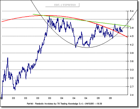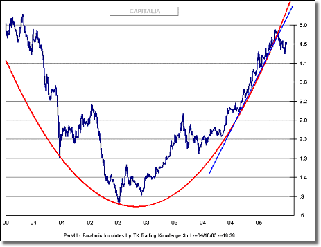 periodo corrispondente alla massima crescita del titolo Capitalia, l’evolvente parabolica di supporto, violata contestualmente alla trendline