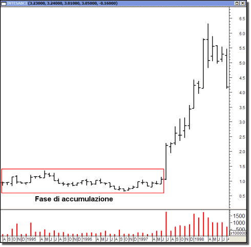 Accumulazione (Accumulation). Fase di mercato caratterizzata da ingenti acquisti a prezzi mediamente bassi effettuata da investitori professionisti. Tale fase puň durare anche molto a lungo poiché l’obiettivo principale č rappresentato dalla raccolta del maggior quantitativo possibile di titoli senza che tale operazione generi un aumento delle quotazioni. Una volta terminata la fase di accumulazione si dŕ il via a una fase di rialzo che spinge sempre piů investitori a entrare in acquisto. Questo meccanismo porta inevitabilmente a un aumento dei prezzi che spesso culmina con momenti di vera e propria euforia che coincidono con i massimi del mercato. Al termine di questi movimenti inizia la fase di distribuzione e il successivo calo della quotazioni.